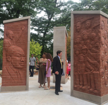 The Martin Luther King, Jr. Living Memorial was dedicated on August 5, 2016 to mark the fiftieth anniversary of Dr. King’s historic march through Marquette Park. Produced by artists Sonja Henderson and John Pittman, the artwork is composed of an oval-shaped plaza with three carved brick rectangular obelisks and a low seating wall.