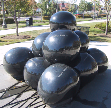 The centerpiece of the 1.25 acres Renaissance Park is a sculptural fountain produced by artist Jerzy Kenar. The artwork symbolizes the strength and energy of the residents of the surrounding neighborhood as well as the African American community in general. A pyramidal pile of black granite spheres represents significant African American figures who have made important contributions to music, literature, sports, politics, and social change. The names of eleven significant individuals such as Martin Luther King, Rosa Parks, Harold Washington, and Maya Angelou are incised into the stone.